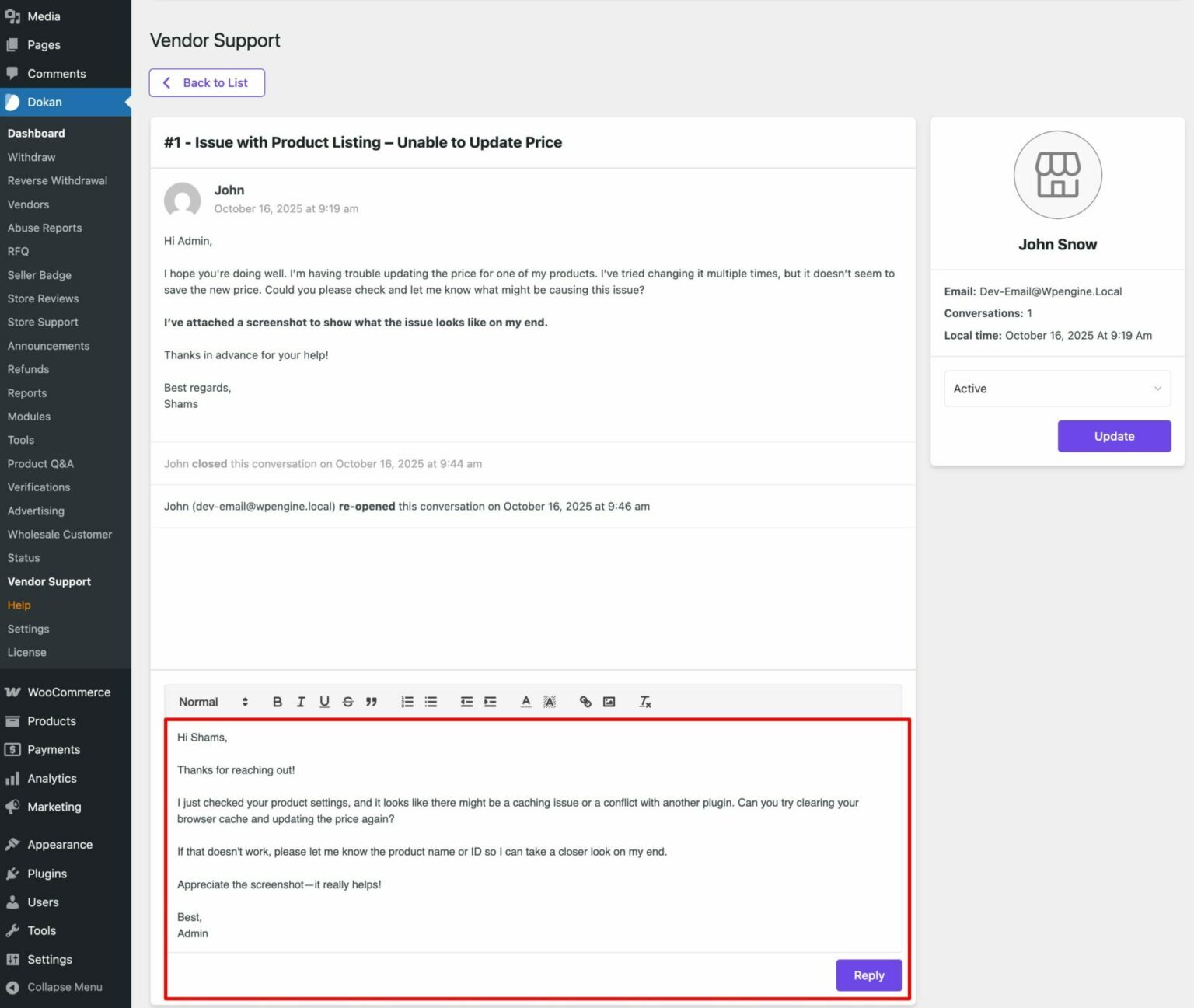 Ans: Yes, any site admin with access to the Dokan dashboard can view and respond to vendor support messages. This allows your team to collaborate and manage vendor queries more efficiently.