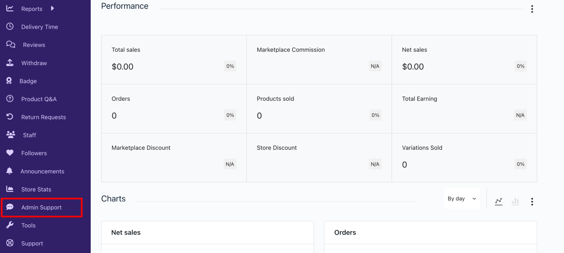 - Click on Admin Support: From the vendor dashboard, locate and click on the Admin Support button on the left-hand menu.