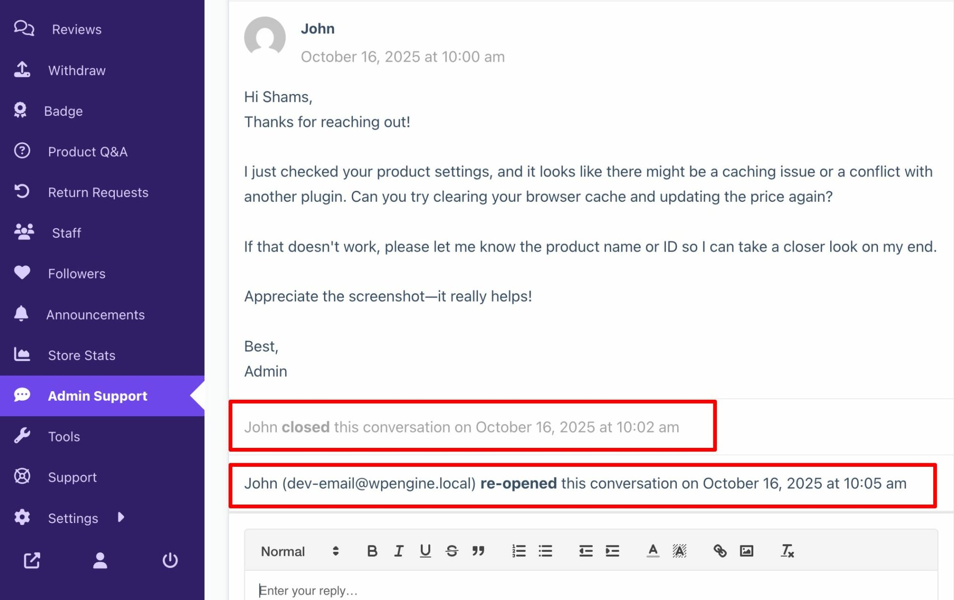 Additionally, if the admin wants to send replies from the admin dashboard and have those replies sent to the vendor’s email inbox (along with the vendor dashboard), that can also be enabled.