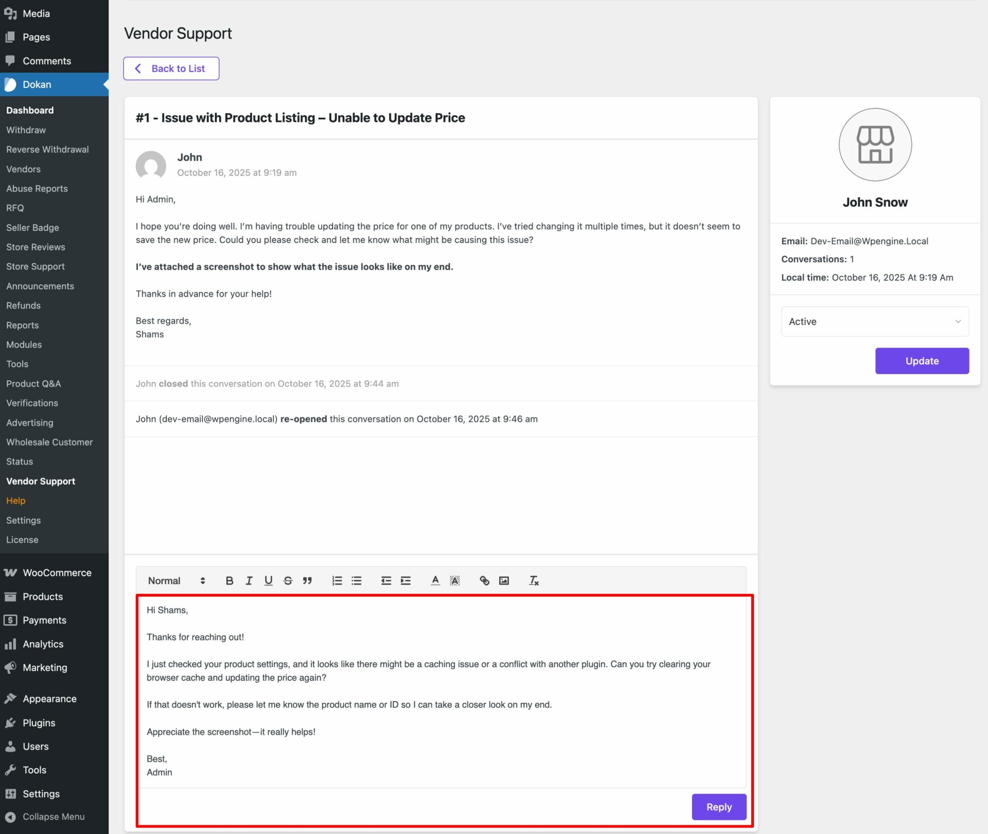 The module is available for every premium tier of the Dokan Pro plugin. Once enabled, it opens up a new channel for faster resolutions and better collaboration.