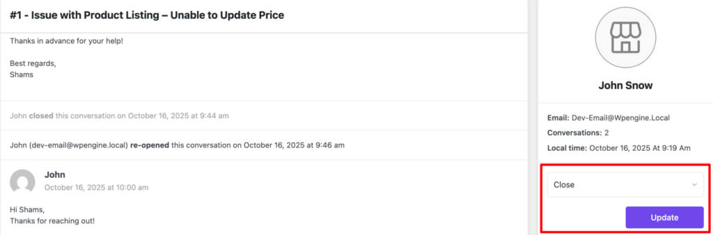 After replying to the query, if you think that the question is properly addressed, you can close the ticket by updating the status. Choose ‘Close‘ from the drop-down and hit the ‘Update’ button.