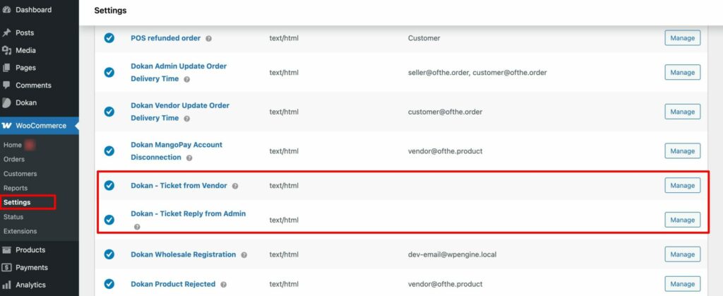 - To do that, click on the ‘Dokan – Ticket from Vendor‘ or ‘Manage’ next to it.