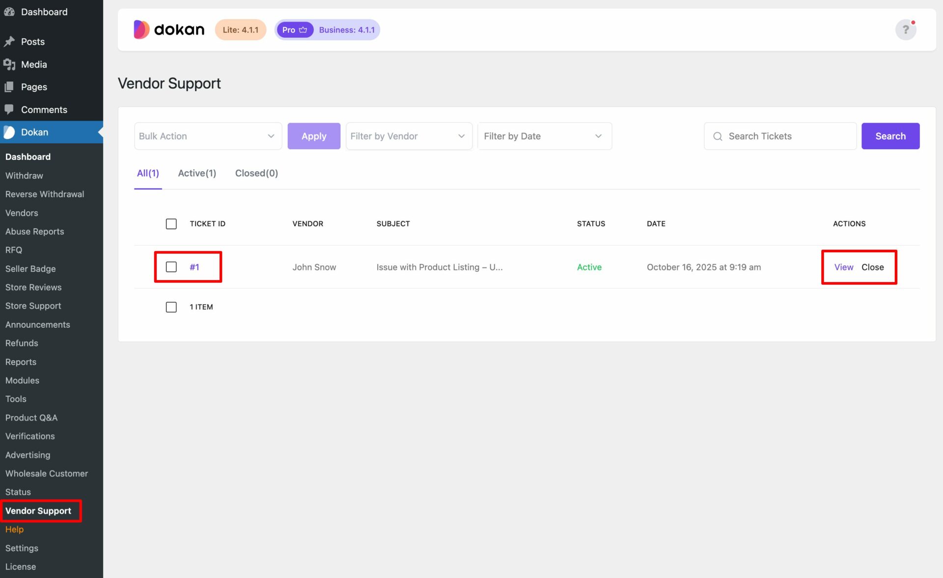 - Actions: In this column, vendors will find options to either View the ticket or Close it. If the admin has responded, the vendor can view the conversation here. Once the issue is resolved, the vendor can close the ticket.