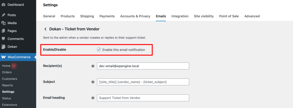- Find the ‘Dokan – Ticket from Vendor’ and ‘Dokan – Ticket Reply from Admin‘ options.