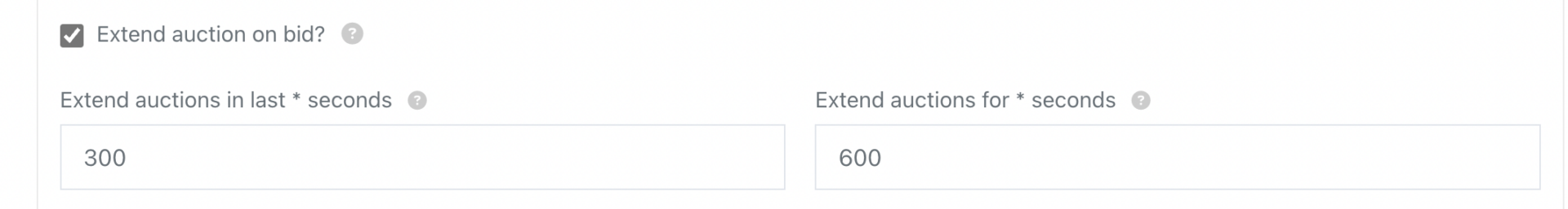 Extend auctions for * seconds: Determine the number of seconds the auction will be extended. For example, if you enter 600 seconds (10 minutes), then the auction will be extended by 10 minutes.